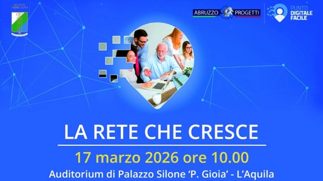 L’AQUILA – La Regione Abruzzo e la società Abruzzo Progetti presentano il potenziamento della rete “Punto Digitale Facile”, il servizio gratuito di assistenza e formazione dedicato ai cittadini per facilitare l’utilizzo delle tecnologie e dei servizi digitali nella vita quotidiana. L’appuntamento è fissato per martedì 17 marzo 2026 alle ore 10.00 all’Auditorium di Palazzo Silone “P. Gioia”, a L’Aquila.
