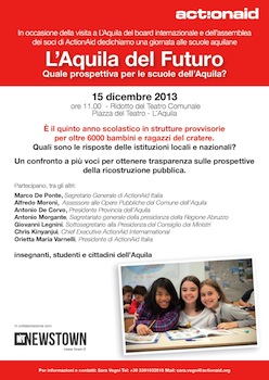 L’evento è organizzato in occasione della visita a L’Aquila del Consiglio Direttivo Internazionale e dell’Assemblea Italiana dei Soci di ActionAid ed è dedicato alle scuole aquilane