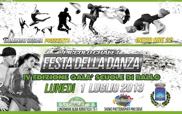 ALBA ADRIATICA (TE) – Oggi,1 luglio 2013 dalle ore 21.30 la storica pista da ballo del Piccolo Chalet di Alba Adriatica, sarà ufficialmente inaugurata ed ospiterà le migliori scuole di danza d’Abruzzo e Marche. La manifestazione ideata dal Maestro Domingo Cesar è stata patrocinata dal Comune di Alba Adriatica e dall’Unione dei Comuni della Val Vibrata.