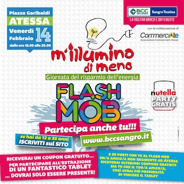 ATESSA (CH) – Venerdì , 14 febbraio 2014 ad Atessa, si terrà un flash mob in piazza Garibaldi, nell’ambito della decima edizione della campagna di sensibilizzazione “M’illumino di meno”, la Giornata del risparmio energetico promossa dalla trasmissione Caterpillar di Rai Radio2. Il richiamo ad un uso consapevole dell’energia viene da Bcc Sangro Teatina che suggerisce quattro piccoli gesti: spegnere le apparecchiature non utilizzate o in standby, abbassare la temperatura del riscaldamento e indossare un maglione, lasciare spente le luci non necessaria, lasciar perdere l’ascensore e salire a piedi. L’appuntamento è dalle 18.00 alle 20.00, durante la messa in onda della trasmissione radio.