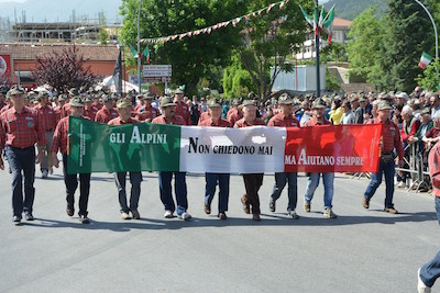 La sfilata è stata aperta dagli alpini in armi del 9° reggimento e dagli ufficiali delle Truppe Alpine. Quindi sono stati resi gli onori al Labaro dell’Ana che si fregia di 216 medaglie d’oro. I più applauditi sono stati i reduci che hanno sfilato sui mezzi d’epoca. Dal palco delle autorità hanno applaudito gli alpini il presidente dell’Ana Sebastiano Favero, il sindaco Massimo Cialente, il ministro della Difesa Roberta Pinotti, il Capo di Stato Maggiore della Difesa gen. Claudio Graziano e dell’Esercito, gen. Danilo Errico e il comandante delle Truppe Alpine gen. Federico Bonato. Il fiume di penne nere ha continuato a scorrere fino a tarda sera quando un applauso più fragoroso è stato tributato agli alpini abruzzesi che hanno portato in sfilata uno striscione di 99 metri, a simboleggiare le 99 chiese della città. Sopra di esso la scritta “Jemm’nanz” (andiamo avanti), un auspicio per ricostruire la città e ricreare il calore di una comunità, ferita ma non doma.