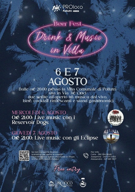 POLUUTRI – Le serate estive a Pollutri si accendono con due appuntamenti imperdibili tra musica, sapori e atmosfere suggestive. La Villa Comunale, in via Tre Croci, ospiterà infatti una serie di serate all’aperto dedicate al divertimento, alla convivialità e alla magia delle notti d’agosto a cura della Pro Loco Pollutri APS.