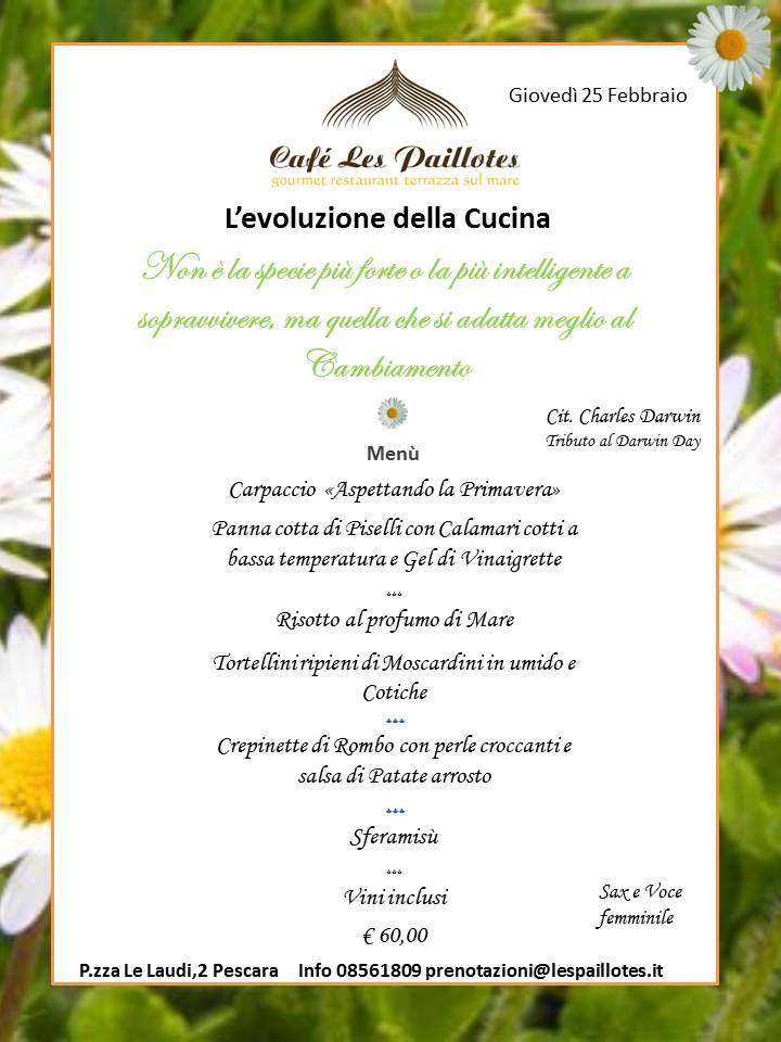 PESCARA – Giovedì 25 febbraio il Café Les Paillotes presenta l’evento tributo a Charles Darwin “L’evoluzione della cucina”.