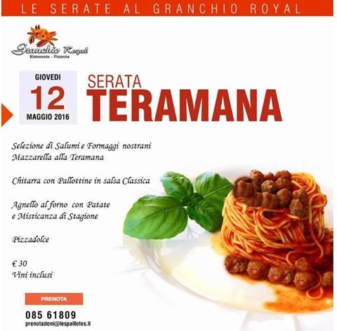 PESCARA – Domani, giovedì 12 maggio, il Granchio Royal presenta la cena dedicata “Serata Teramana”. Velia Gentile, chef per passione e blogger per caso, proporrà il gusto della tradizione teramana, con una cucina casereccia e contadina fatta di sapori semplici e genuini.