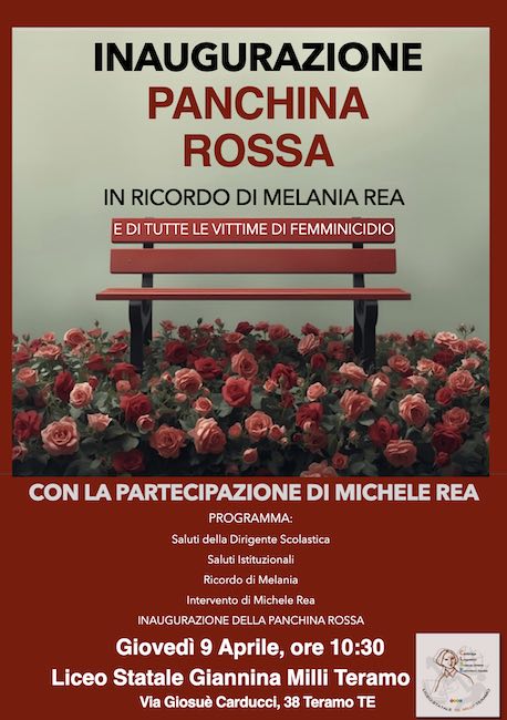 TERAMO – Una panchina che parla, che invita a fermarsi e a ricordare. Giovedì 9 aprile, alle 10.30, il Liceo “G. Milli” di Teramo inaugurerà una panchina rossa dedicata a Melania Rea, giovane madre vittima di femminicidio. Un gesto simbolico e potente, pensato per restare nel tempo e per continuare a interrogare le coscienze.
