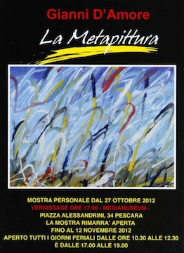 PESCARA – Oggi ,27 ottobre,alle ore 17.00, presso il Mediamuseum di Pescara , in Piazza Alessandrini, 34, sarà inaugurata la mostra personale di pittura dal titolo “La Metapittura” del Maestro Gianni D’Amore. Ingresso libero. L’esposizione sarà aperta tutti i giorni feriali dalle 10,30 alle 12,30 e dalle 17 alle 19 fino al 12 novembre.