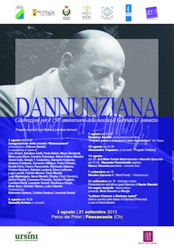 FOSSACESIA (CH) – Con la inaugurazione della Mostra di Arte contemporanea, alla presenza del Presidente della Provincia di Chieti Enrico di Giuseppantonio e del Sindaco di Fossacesia Dott. Fausto Stante, si apre, sabato 3 Agosto alle ore 18,30 presso il Parco dei Priori in Fossacesia, il Progetto DANNUNZIANA che rientra nelle proposte culturali che nella Regione si organizzano per ricordare il 150° anniversario della nascita di Gabriele D’Annunzio.