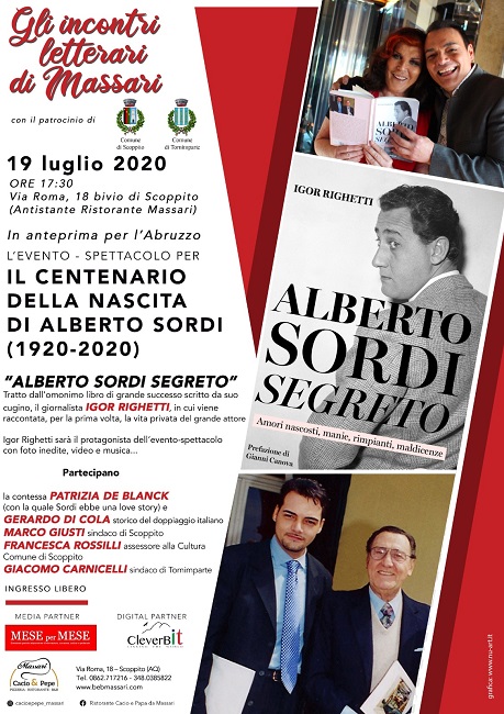 SCOPPITO (AQ) – In anteprima per l’Abruzzo, domenica 19 luglio alle 17.30 a Scoppito (L’Aquila) in via Roma 18, si terrà l’eccezionale evento-spettacolo “Alberto Sordi segreto” ideato e condotto dal giornalista, già conduttore radiotelevisivo Rai, Igor Righetti (“Il ComuniCattivo” su Rai Radio 1, Rai2 e Tg1 libri), cugino del grande attore da parte della madre di Sordi, Maria Righetti. L’evento, a ingresso libero, ha il patrocinio dei Comuni di Scoppito e di Tornimparte. Arriva in Abruzzo grazie all’imprenditore di Scoppito Emanuele Massari che lo ha inserito nella sua manifestazione “Gli incontri letterari di Massari”. Apriranno lo spettacolo il sindaco e l’assessore alla Cultura del Comune di Scoppito, Marco Giusti e Francesca Rossilli, e il sindaco di Tornimparte Giacomo Carnicelli. Parteciperanno anche la contessa Patrizia de Blanck, (con la quale Sordi ebbe una love story nei primi anni Settanta) e lo storico del doppiaggio Gerardo Di Cola, il quale si soffermerà sui film doppiati da Sordi e su quelli in cui lui stesso fu doppiato.