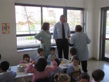 PESCARA – Il sindaco di Pescara Luigi Albore Mascia ,accompagnato dalla Responsabile di servizio Enrica Di Paolo, ieri ha pranzato nella mensa della scuola materna di via Rubicone con i bambini ,di età compresa tra i 3 e i 6 anni, che lo hanno atteso a tavola, dinanzi al piatto di tagliatelle al sugo previste nel menù della scuola.E’ stata una giornata di festa per conoscere meglio i compiti di un sindaco e, al tempo stesso, per conoscere cosa fanno i nostri bambini nella scuola materna comunale .