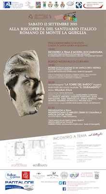 CORVARA (PE) – La Soprintendenza Archeologica per l’Abruzzo (SAA), l’Archeoclub onlus d’Italia – sede di Cepagatti e l’Associazione culturale “Tutti pazzi per Corvara” con il Patrocinio della Provincia di Pescara e dei Comuni di Corvara, Pescosansonesco e Cepagatti, organizzano per sabato 12 settembre 2015 a partire dalle ore 16:00 presso la Chiesa di Santa Maria in Blesiano a Pescosansonesco Nuovo e dalle ore 19:00 presso il borgo medievale di Corvara l’iniziativa “ALLA RISCOPERTA DEL SANTUARIO ITALICO ROMANO DI MONTE LA QUEGLIA”.