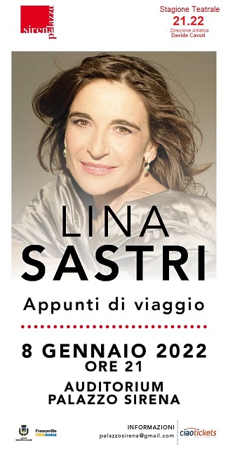 FRANCAVILLA AL MARE – Riparte la stagione teatrale dell’«Auditorium Sirena» di Francavilla al Mare, con la direzione artistica del compositore e regista Davide Cavuti: sabato 8 gennaio alle ore 21, sarà in scena una delle più importanti interpreti del teatro italiano, l’attrice Lina Sastri che aprirà la stagione teatrale con il suo spettacolo «Appunti di viaggio», (biglietti acquistabili su Ciaotikets e al Foyer del Teatro). Accanto all’attrice napoletana, sul palcoscenico, ci sarà il trio di musicisti composto da Gennaro Desiderio al vìolino, Gianluca Mirra alla batteria Filippo D’Allio alla chitarra. Un viaggio, sempre nuovo, nel teatro, nella musica e nel cinema italiano, attraverso i racconti di vita vissuta, gli incontri indimenticabili con le grandi personalità artistiche del nostro paese (da Eduardo a Patroni Griffi, da Roberto De Simone ad Armando Pugliese), con i poeti e i drammaturghi, gli autori e i registi come Nanni Moretti, Nanni Loy, Carlo Lizzani, Woody Allen, Giuseppe Tornatore. Il racconto dell’incontro fatale e improvviso con la musica risveglia ricordi antichi di infanzia: la madre forte e melodiosa, il padre partito per il Sudamerica. Tutto liberamente proposto da Lina Sastri, accompagnata in scena dai suoi valentissimi musicisti capaci sempre di cogliere l’attimo, seguire o anticipare il racconto musicale della sua vita. I brani musicali vanno da “Madonna de lu Carmine” scritta da Roberto De Simone per lo spettacolo Masaniello, alla “Taranta del Gargano”, da “Canzone Appassionata” a “Bammenella”, da “A vita è comme ‘o mare” a “Assaje”, scritta proprio per Lina da Pino Daniele per il film Mi manda Picone, da “La Profezia”, canzone del film “Li Chiamarono… Briganti” di Pasquale Squitieri a “Sud scavame ‘a fossa”, brano inedito di Pino Daniele cantato a rap, dall’inedito “Edua’”, dedicato a Eduardo De Filippo, a “Uocchie c’arraggiunate”, da “Tammurriata nera” a “Amara terra mia” di Domenico Modugno.