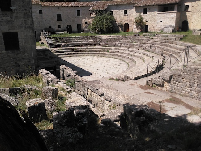 Di quelle lontane epoche non è rimasto molto ma due siti collegati a questo evento, ambedue in Molise, sono di grande interesse e suggestione e se ne consiglia la visita. Il primo, non lontano dal fiume Trigno che separa l’Abruzzo dal Molise, è il santuario italico di Pietrabbondante. Questo complesso, costruito tra il III e il I sec. a.C., è costituito da due templi e un teatro. Luogo principe di identità collettiva, Pietrabbondante non era riservata solo al culto ma anche alle decisioni politiche pubbliche. Il complesso si adagia sul dorso di una collina con un panorama, siamo a poco più di 1000 m. di altezza, mozzafiato. Alture fittamente boscose si stendono a perdita d’occhio mentre il santuario si articola in un grande tempio che sovrasta un ampio teatro, unico esempio dell’antichità in cui i sedili sono completati da schienali (!), e un altro tempio più piccolo a fianco del teatro. É dal tempio maggiore che lo sguardo spazia sia sul sito sia sulla vallata che si stende davanti; l’impressione è di una grande, solenne, composta austerità nonché di un tesoro ancora tutto da scoprirsi quando, osservando la zona non aperta al pubblico, si notano colonne e muri portati recentemente alla luce con gli scavi tuttora attivi.