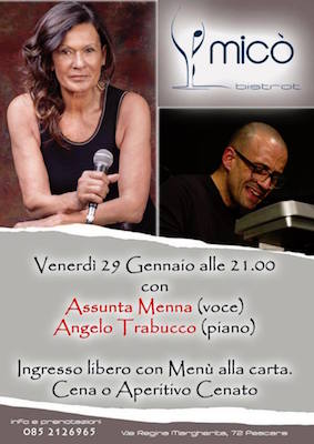 PESCARA – Assunta Menna e Angelo Trabucco Jazz, duo Piano e Voce, già consolidato da tempo, si esibirà venerdì 29 gennaio in un nuovo e accogliente locale di Pescara, il Micò Bistrot (via Regina Margherita 72).