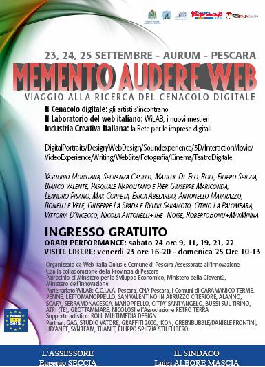 Memento Audere Web ripercorre i sogni di D?Annunzio coinvolgendo artisti e creativi in un viaggio di condivisione tra esperienze digitali e contaminazioni interattive. Pescara diventa sede ideale di alcuni tra i grandi eventi in tema di innovazione e tecnologie che si terranno in Italia nel 2012, nell?intento di realizzare idealmente il sogno dannunziano.L’ingresso è gratuito.