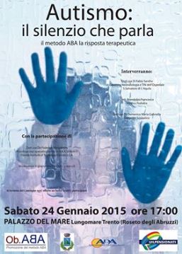 ROSETO DEGLI ABRUZZI (TE) – Sabato prossimo, 24 gennaio alle ore 17, presso il Palazzo del Mare a Roseto degli Abruzzi (lungomare Trento) ci sarà un convegno dal titolo: “Autismo: Il Silenzio Che Parla – il Metodo A.B.A. la risposta terapeutica”. Interverranno la Dott.ssa Sandra Di Fabio, Direttore Neonatologia e TIN dell’Ospedale S. Salvatore di L’Aquila, il Dott. Francesco Brandolini, Medico Pediatra, Dott.ssa Maria Gabriella Di Domenico, Dirigente Scolastico, la Dott.ssa Alessandra De Federicis, Psicologa con specializzazione in A.B.A. presso il Floride Institute Technology (USA). Modera l’incontro il giornalista RAI, Dott. Umberto Braccili.