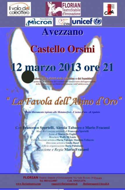AVEZZANO (AQ) – Martedì 12 marzo alle ore 21 presso il Castello Orsini di Avezzano il Teatro Stabile d’Innovazione FLORIAN di Pescara e l’Associazione culturale IL VOLO DEL COLEOTTERO di Avezzano in collaborazione con il CVM (Comunità Volontari per il Mondo) e il patrocinio dell’Unicef Abruzzo, presentano lo spettacolo “La Favola dell’Asino d’Oro”, molto liberamente ispirato alle Metamorfosi – L’asino d’oro – di Apuleio,con Francesco Sportelli, Alessia Tabacco e Mario Fracassi;Musiche e canzoni originali di Francesco Sportelli;Scene di Marco De Foglio;Maschere Wally Di Luzio;Collaborazione artistica Flavia Valoppi, Massimo Vellaccio;Direzione artistica Giulia Basel;Ufficio organizzazione Ilaria Palmisano;Ideazione e Regia Mario Fracassi.