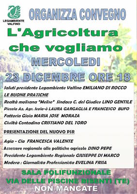 BISENTI (TE) – Si terrà domani, 23 dicembre 2015, alle ore 18, nella sala polifunzionale di Bisenti un convegno a cura di Legambiente Valfino dal titolo: “L’Agricoltura che vogliamo”. L’incontro è organizzato in due parti, nella prima ci saranno gli interventi di alcuni agricoltori che parleranno delle loro “buone pratiche”: dal biologico, alla produzione delle cultivar locali, passando per la tutela del territorio. Nella seconda parte si parlerà delle opportunità del nuovo Psr alla presenza dell’assessore regionale alle politiche agricole, Dino Pepe.
