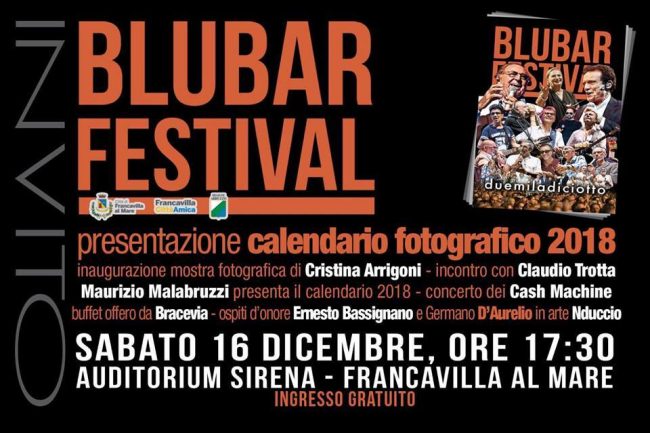 FRANCAVILLA AL MARE – Si terrà sabato 16 dicembre a Francavilla al Mare la presentazione del calendario fotografico 2018 del Blubar Festival. L’evento, che sarà a ingresso libero, si sposta quest’anno dal MuMi all’Auditorium Sirena, appena inaugurato in centro.