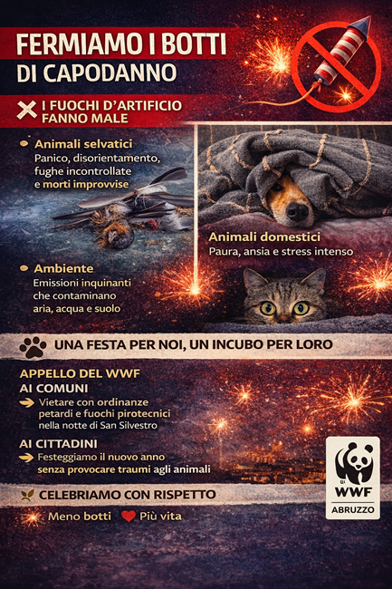 REGIONE – Provocano traumi, disorientamento, fughe caotiche e shock immediati negli animali selvatici, con conseguenze spesso mortali: ma anche effetti a lungo termine, come alterazioni comportamentali e danni al sistema riproduttivo. Causano panico, ansia e stress negli animali domestici. Non solo: i botti in città possono danneggiare anche la vegetazione: le alte temperature e le scintille possono innescare incendi o provocare bruciature a chiome e tronchi di alberi, mentre i residui chimici ricadono sul suolo compromettendo la salute di alberi e aiuole urbane. A tutto questo si aggiunge un inquinamento atmosferico non trascurabile, per la presenza di metalli pesanti, particolato e perclorati. Stiamo parlando dei fuochi pirotecnici, che salutano ogni 31 dicembre l’arrivo del nuovo anno. Una tradizione che ha portato negli anni anche morti e feriti gravi tra le persone e che sarebbe ora di abbandonare, per noi e per i nostri amici animali. Magari sostituendoli con opzioni a basso rumore oppure giochi di luci. È questa la richiesta del WWF, che lancia un appello ai comuni affinché vietino, con una apposita ordinanza, i botti di Capodanno nel loro territorio, come Roma e altri comuni hanno fatto negli ultimi anni, purtroppo con un livello di rispetto delle regole ancora troppo basso da parte dei cittadini.