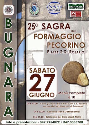 BUGNARA (AQ) – Sabato prossimo, 27 giugno, a Bugnara, presso Piazza S.S Rosario, si svolgerà la 25a edizione della “Sagra del Formaggio Pecorino” a cura dell’associazione Pro Loco Bugnara, in collaborazione con il Comune di Bugnara.