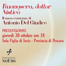 PESCARA – Giovedì 30 ottobre, alle ore 18.00, presso la sala Figlia di Iorio della Provincia di Pescara, sarà presentato in anteprima nazionale il nuovo romanzo di Antonio del Giudice, “Buonasera, dottor Nisticò” (Edizioni Noubs). Partecipano: Mauro Tedeschini, direttore del quotidiano “Il Centro”, Silvia Mazzone, Università La Sapienza, Marco Presutti, docente di lettere, Antonio Di Marco, Presidente della Provincia di Pescara, Marco Alessandrini, Sindaco di Pescara.