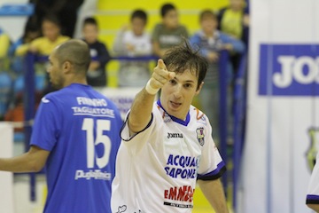 IL MATCH – Nel primo tempo, come un torero nella corrida, la squadra di Bellarte infligge il primo colpo dopo un minuto (sinistro sotto l’incrocio di Cuzzolino) e poi usa tutta la sua capacità di gestione del pallone e fase difensiva per far correre l’avversario e matarlo. Quello che manca è la concretezza nelle uscite dal pressing o nelle ripartenze, che permetterebbe di stendere definitivamente il toro-Martina. La squadra di Basile, infatti, conferma sul campo di meritare i suoi nove punti e mette in difficoltà i nerazzurri in diverse occasioni. Mammarella spesso e volentieri si traveste da uomo ragno per negare il gol ai pugliesi. C’è anche un palo di Paulinho nel mezzo. Passano i minuti, e la lucidità cala. E qui che invece la freddezza degli uomini di Bellarte esce fuori: prima Coco prende un palo, a 3’ dalla sirena Cuzzolino con un destro secco trova l’angolino impossibile da chiudere per Lopopolo. Unico neo di un primo tempo gestito con sapienza dopo 19’55’: Arellano accorcia le distanze con un rasoterra, servito da Saul che viene lasciato libero di lavorare il pallone. Una mezza beffa, che Zanchetta e compagni cercano di dimenticare nei primi minuti del secondo tempo. La squadra di Bellarte mette sotto i pugliesi e prende subito un palo con Cuzzolino. Poi Lopopolo salva i suoi in almeno due occasioni. Lo spacca partita è sempre Chaguinha, che trova le giocate con facilità e mette in condizione i compagni di essere sempre insidiosi. Ma la mole di gioco nerazzurra non viene concretizzata e arriva la punizione: dopo 7’ Dao trova l’angolino con l’aiuto di una leggera deviazione di Murilo e pareggia. Il capitano, però, mette una firma più importante sulla partita: all’8’ riceve un assist meraviglioso da Cuzzolino e di piatto firma il 3 a 2. Momento delicato che si spezza quando Chaguinha, servito da Zanchetta, può mettere dentro il poker. Per il Martina piove sul bagnato perché Arellano deve sacrificarsi per fermare Cuzzolino inarrestabile: secondo giallo e doccia anticipata. Il clima si scalda, qualcuno perde le staffe e la partita diventa un susseguirsi di emozioni. Dao si fa espellere e commette il sesto fallo su Zanchetta. Cuzzolino implacabile dal dischetto firma il 5 a 2. Gara in cassaforte? Macché, il Martina ha orgoglio e grinta: Bocao con un po’ di fortuna trova il terzo gol. Entra Fininho portiere di movimento, ma l’AcquaeSapone non punisce: Luiz Paulo prende una traversa a 2’ dalla fine, poi Calderolli sbatte sul palo. Ma al Palaroma è ancora festa.