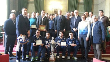 PESCARA – Questa mattina presso la sala Tinozzi del Palazzo dei Marmi, Provincia e Comune di Pescara c’è stata la cerimonia di consegna dei riconoscimenti alla società e alla squadra dell’AcquaeSapone che la scorsa settimana ha conquistato la Coppa Italia di calcio a 5.