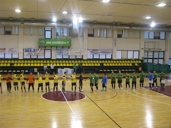 IL MATCH – La cronaca del match si apre con una conclusione di Tolli che finisce a lato. Ancora lui poco dopo impegna Abate, ma è un fuoco di paglia: il Cus infatti comincia a prendere le misure agli avversari e li chiude nella loro metà campo. Di Muzio Luca mette un invitante pallone al centro, ma Galliani Matteo non ci arriva per un soffio. Altra bella azione dei teatini con un buon dialogo fra Di Muzio Luca e Cornacchia, il capitano angola troppo la mira. La Fenice difende in maniera arcigna e Mister Di Muzio mischia le carte per sfondare il muro avversario: proprio Di Muzio Fabiano offre il pallone a Cornacchia che si libera di un difensore e trova il primo gol. La Fenice prova a reagire con Zazzara che impegna severamente Abate. Di Girolamo chiama poi Sacco alla gran parata in tuffo. Il raddoppio è solo rimandato di poco: Di Muzio Luca fredda Sacco con un tocco “sotto” ravvicinato che si infila sotto l’incrocio. Il primo tempo si chiude sul 2-0 per il Cus Chieti.