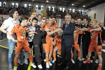 Una finale degnissima di un pubblico, quello del Pala Giovanni Paolo II, straordinario: oltre 2000 spettatori presenti, con gli sbandieratori di Bucchianico a dare spettacolo prima del match e durante l’intervallo. Sempre prima della gara, premiata la scuola Mario Giardini di Penne, vincitrice del concorso dedicato alle scuole nell’ambito del progetto “I valori scendono in campo”: a premiarla, con una medaglia conferita dal presidente della Repubblica, direttamente il presidente del Settore Giovanile e Scolastico, Gianni Rivera. Lo stesso Rivera, assieme al presidente della Divisione Calcio a cinque FabrizioTonelli, ha premiato anche il presidente di A.G.B.E. Onlus, Massimo Parenti, con una targa conferita anch’essa dalla presidenza della Repubblica.