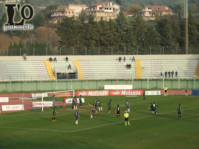 IL MATCH – Chieti in campo con gli stessi undici di Recanati. La Folgore Veregra si schiera con il tridente d’attacco Pedalino – Nazziconi – Padovani. Al 6′ marchigiani in vantaggio: Vitale devia la palla sulla traversa sul tiro di Padovani, ma sulla traiettoria si avventa Traini che segna in rovesciata corregge a rete. Al 10′ Pedalino dal limite sfiora il raddoppio. Al 29′ Traini scalda i guanti a Fatone che smanaccia il suo pericoloso tiro in angolo. Dieci minuti più tardi il Chieti pareggia con Varone bravissimo a trovare una parabola micidiale da posizione impossibile: la palla si insacca dove Marani non può proprio arrivare. Al 42′ Zanetti ha la peggio in uno scontro di gioco e rimane fuori campo per qualche minuto (rientrerà con una vistosa fasciatura alla testa, ma rimarrà stoicamente sul terreno di gioco). Ronci poco dopo viene espulso su segnalazione del guardialinee (il mister spiegherà poi in sala stampa di essere stato cacciato ingiustamente visto che stava semplicemente dando indicazioni alla squadra). Il primo tempo si chiude sull’1-1.