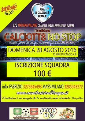 RANCAVILLA AL MARE (CH) – L’ a.s.d. “AMA IL CALCIO A 5 LEAGUE”, organizza la prima edizione del più grande evento amatoriale del panorama di calcio a 8 abruzzese chiamato “CALCIOTT8 NO STOP”. Questo irrinunciabile appuntamento si terrà domenica 28 agosto 2016, presso il “tikitaka village”, sito in Francavilla al mare, c.da Valle Anzuca. Viene riproposta la formula delle dodici ore di gioco “no stop”, a partire dalle ore 10.00 fino ad arrivare alle ore 22.00, all’ insegna del divertimento e del fair play.