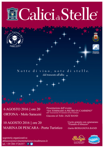 le due serate a Ortona il 6 Agosto sul bellissimo Molo Saraceni che conduce al famoso faro rosso, i calici di vino saranno accompagnati dalle degustazioni di pesce dell’azienda Mitilmare e musica live con il trio “Di Tollo Jazz Band”. All’interno della serata ci sarà la presentazione dell’evento “Da Tommaso a Pietro, in Cammino”, progetto internazionale dell’Associazione “il Cammino di San Tommaso” che prevede un viaggio a piedi da Ortona a Roma e in partenza proprio il giorno dopo dalla cittadina adriatica. Previsto servizio di bus navetta gratuito in partenza da Piazza Porta Caldari dalle ore 20.