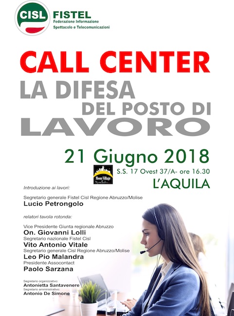 L’AQUILA – Giovedì 21 giugno 2018, alle ore 16.30,a L’Aquila, presso Moonvillage, si parlerà del mondo dei call center un settore produttivo che rappresenta una risorsa per L’Abruzzo.
