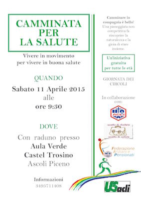 ASCOLI – Sabato 11 aprile con partenza alle ore 9.30 torna la “Camminata della salute”, l’iniziativa dell’U.S. Acli Marche per promuovere uno stile di vita sano tra i cittadini. Punto di ritrovo presso l’Aula verde di Castel Trosino. Il programma dell’iniziativa, che si svolgerà in occasione della “Giornata dei circoli”, prevede il raduno dei partecipanti entro le ore 9,15 e la registrazione degli stessi ed alle ore 9,30 la partenza per una camminata che durerà circa un’ora.