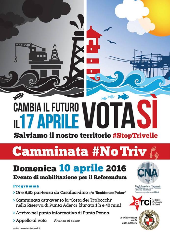CHIETI – La Cna e l’Arci di Chieti, in collaborazione con la Città del Vasto, organizzano per domenica prossima, 10 aprile, la “Camminata NO TRIV” nella riserva di Punta Aderci di Vasto. L’obiettivo è di invitare a votare “SI” al referendum del 17 aprile prossimo, per abrogare la norma che permette alle attuali concessioni di estrazione e ricerca di petrolio e gas, entro 12 miglia dalla costa, di non avere scadenze.