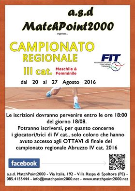 SPOLTORE (PE) – Il Circolo Match Point 2000 di Villa Raspa di Spoltore ospiterà, dal 20 al 27 agosto, il campionato regionale di tennis di 3° categoria, maschile e femminile.