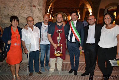 CAMPLI (TE) – Si è conclusa ieri con successo la 44° edizione della Sagra della Porchetta di Campli con la premiazione finale che si è tenuta ieri 23 in Piazza Vittorio Emanuele II. La coppa del primo classificato è andata al porchettaio Nicolino Mercurii (nella foto), seguito da Emidio Falasca, mentre il terzo premio è stato assegnato a Lucio Di Stefano. Sempre al maestro porchettario Emidio Falasca è stato assegnato il premio speciale della critica, assegnato alla memoria del professor Nicola Biagio Natali, presidente storico della giuria. Il vincitore è stato scelto tra 9 porchettai partecipanti e votato da tre giurie tecniche, composte da enologi, giornalisti, cuochi esperti ed infine da una giuria popolare, scelta a sorte tra i vari candidati. Bilancio positivo della manifestazione con ben 100.000 presenze e 300 porchette servite. Una riconferma per Campli come “regina” delle sagre d’Abruzzo. Migliaia di persone infatti hanno invaso il centro del paese svuotando i banconi dei porchettai e grande affluenza è stata registrata anche alla Scala santa e negli altri monumenti rimasti aperti fino a notte fonda.
