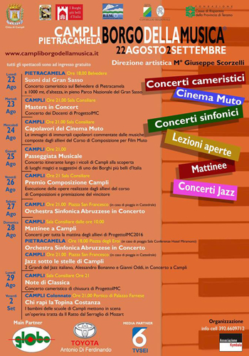 Interverranno: la Senatrice Stefania Pezzopane, i Sindaci di Campli e Pietracamela Pietro Quaresimale e Michele Petraccia, Il Presidente dell’ISA Antonio Centi, Il Direttore Artistico Giuseppe Scorzelli Dal 22 Agosto al 2 Settembre 2016 gli appassionati italiani ed europei di musica classica si ritroveranno nelle meravigliose cornici dei Borghi di Campli e Pietracamela per un viaggio di 2 settimane nella cultura musicale. La manifestazione, nata nel 2010 con la direzione artistica del M° Giuseppe Scorzelli, è diventata uno dei Festival culturali più attesi a livello internazionale.