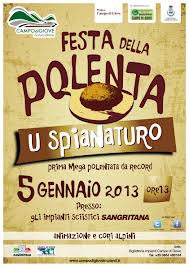 CAMPO DI GIOVE – Domani, 5 gennaio presso gli Impianti Sciistici Sangritana di Campo Di Giove appuntamento con la Festa della polenta ‘U Spianaturo’. Una giornata all’insegna del divertimento e del buon gusto con la prima mega polenta da record. Oltre alla degustazione di uno dei piatti tipici di questo periodo in montagna, sono previsti, dalle ore 11 in poi, passeggiate nei boschi circostanti con le guide di Majella Trekking, animazione musicale con il dj Gaetano “Dado” D’Amico, cori alpini e banda musicale, fino a giungere all’appuntamento delle ore 13 con la polenta in tavola.