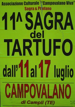CAMPOVALANO (TE) – Al via , oggi 11 luglio, la manifestazione “Sagra e Profano” che, per l’Associazione “Campovalano Viva”, rappresenta il momento più importante della stagione. Il programma delle manifestazioni che l’’Associazione propone, va al di là della classica sagra di paese poiché oltre a proporre deliziosi piatti a base di tartufo permette anche una riflessione culturale.