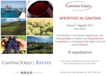 TOLLO (CH) – Domani, 1 agosto 2014,alle ore 18.00 in Cantina Tollo, a Tollo in provincia di Chieti, si terrà il primo di una serie di eventi – in orario aperitivo – che celebrano l’estate, il vino e la buona musica.Un happy hour con tanto di visita guidata alla storica cantina abruzzese è la nuova formula di eventi che Cantina Tollo ha in programma per tutta l’estate: altre due sono infatti le date in programma per il mese di agosto, venerdì 8 e martedì 12, sempre alle ore 18.00.