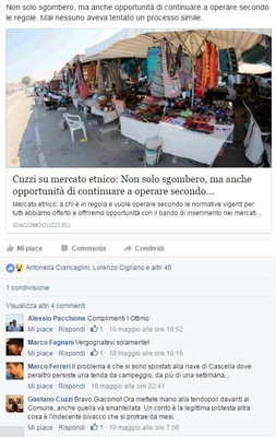 “L’episodio risale allo scorso 19 maggio, ma solo ora le immagini presenti sui profili facebook ufficiali dell’assessore Giacomo Cuzzi e del padre, Gaetano Cuzzi, stanno rimbalzando sui social, evidentemente aggiornati da qualche commento recente – ha spiegato il Capogruppo Sospiri -. In sostanza, il 18 maggio è stato smantellato il mercatino etnico abusivo sulle aree di risulta, operazione di cui il democratico Pd Giacomo Cuzzi, assessore al Commercio, si vanta sul suo profilo facebook. Ma il fattaccio accade il 19 maggio, quando appare un commento del padre dell’assessore, l’ex Presidente della Provincia socialista Gaetano Cuzzi il quale, alle 7.56, posta sul profilo del figlio: ‘Bravo Giacomo! Ora mettete mano alla tendopoli davanti al Comune, anche quella va smantellata. Un conto è la legittima protesta altra cosa è l’indecente bivacco che si protrae da mesi’. Una frase scioccante che ha lasciato tutti di stucco: sconvolge leggere un politico socialista incitare il figlio, che riveste la carica di assessore, allo ‘smantellamento forzoso’ di operai che protestano per la perdita del proprio posto di lavoro, definendo ‘tendopoli’ due strutture assolutamente decorose che quegli operai hanno ricevuto in dono dalla città solidale, e che sono state l’unico loro riparo nei duri mesi invernali appena trascorsi. Ed è altrettanto sconvolgente leggere quello stesso politico socialista definire ‘indecente bivacco’ il legittimo presidio degli ex operai di Attiva: parliamo di persone abituate a lavorare che da 155 giorni, ogni giorno, hanno anche provveduto a tenere pulita piazza Italia, spazzando, con i propri mezzi, l’intera area, sotto gli occhi dell’intera città. Parliamo di 65 lavoratori che da 155 giorni rivendicano, in silenzio, il proprio diritto al lavoro, e lo fanno con la semplice presenza, senza pagliacciate, senza urla, senza occupazioni abusive.