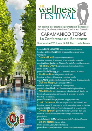Nel pomeriggio di sabato, nella splendida cornice del Parco delle Terme alle ore 17, avrà luogo la Conferenza del Benessere, presentata da Luca Di Nicola, autore e conduttore televisivo. Parteciperanno oltre alla già citata Daniela Uberti, Fabrizia D’Ottavio, campionessa di ginnastica ritmica, che riceverà il Premio Sport e Benessere da Nicola Silvaggi, già C.T. Nazionale Italiana di Atletica, di origini caramanichesi; Rita Borsellino (in collegamento via Skype), alla quale verrà consegnato il Premio ai Facilitatori di Benessere e Giustizia Sociale dal Sottosegretario Regione Abruzzo con delega all’Ambiente Mario Mazzocca; Giuliano Pisapia, già Sindaco di Milano, al quale andrà il Premio ai Creatori di Benessere in ambito politico da Luciano D’Alfonso, Presidente della Regione Abruzzo. Non mancheranno altri nomi legati al benessere nazionale, nelle sue varie forme ed esperienze: ad Aldo Bonomi, sociologo e fondatore Aaster, editorialista de Il Sole 24 Ore, andrà il Premio alla Valorizzazione del Concetto di Benessere in ambito filosofico e sociologico, consegnato da Giovanni Bongo, filosofo, blogger e contadino; a Lucio Cavazzoni, Alce Nero, il Premio ai Creatori di Benessere in ambito agroalimentare e ambientale, da Rossella Muroni, Presidente nazionale di Legambiente; a Donato Speroni, giornalista, Numerus e Corriere della Sera, il Premio ai Valorizzatori di Benessere in campo comunicativo e giornalistico, consegnato da Antonio Di Marco, Presidente della Provincia di Pescara; a Simone Notari, giovane artista, il Premio Speciale Costruttori di Benessere, da Franco Iezzi, Presidente del Parco Nazionale della Majella.