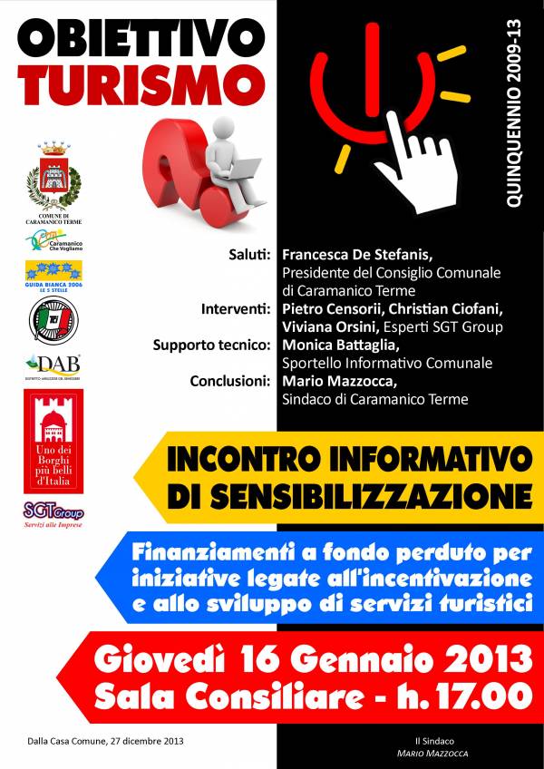CARAMANICO TERME – Giovedì 16 gennaio 2014,alle ore 17.00, presso la Sala Consiliare di Caramanico Terme si terrà un incontro informativo dal titolo “Obiettivo Turismo”,nell’ambito degli appuntamenti ,previsti sul territorio regionale , per spiegare il bando a sostegno dei giovani che intendano intraprendere questa attività e delle piccole e medie imprese già operanti nel settore turistico.L’obiettivo del Progetto regionale è creare servizi migliori e più competitivi o consolidare gli esistenti per incrementare l’offerta turistica.