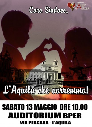 L’AQUILA – L’ Associazione Mamme Per L’ Aquila organizza l’iniziativa “Caro sindaco…L’Aquila che vorremmo”, che si terrà il giorno 13 maggio alle ore 10.00 presso l’Auditorium BPER in Via Pescara L’Aquila.