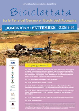 Il giorno successivo, domenica 21, escursione in bicicletta per conoscere il territorio delle Terre del Cerrano e dei borghi degli Acquaviva. Raduno alle ore 9.00 dalla Torre di Cerrano (si consiglia di parcheggiare prima del sottopasso di accesso alla Torre); visita alle Torre e, alle ore 10.00, partenza per l’escursione. Sosta alle ore 12:00 a Casoli di Atri per visitare il museo all’aperto, l’artista che sta dipingendo il pannello murale e per il pranzo.Ripartenza, alle ore 14.30, alla volta di Pineto.