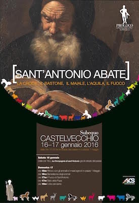 CASTELVECCHIO SUBEQUO (AQ) – Il culto di Sant’Antonio Abate, molto radicato nell’Abruzzo rurale e montano, rappresenta una delle espressione più diffuse da un punto di vista antropologico della religiosità popolare. É il Santo per eccellenza, molto venerato nella cultura contadina, in virtù dell’essere protettore degli animali, quali risorse basilari nell’economia della società agricola-pastorale. Celebrare tale rito, all’inizio dell’anno, subito dopo l’Epifania, con la benedizione degli animali e l’accensione di fuochi, è un evento particolarmente simbolico e ricco di credenze, per esorcizzare i mali e così poter meglio affrontare il nuovo anno lavorativo nei campi e nei pascoli.