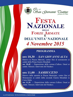 SAN GIOVANNI TEATINO (CH) – Due appuntamenti, come ogni anno, caratterizzano la celebrazione in città del 4 novembre, Festa Nazionale delle Forze Armate e dell’Unità Nazionale. Alle 10.30 in piazza Marconi, San Giovanni Teatino Alta, è previsto il ritrovo del corteo che raggiungerà il Monumento dei Caduti della Prima Guerra Mondiale. Ci sarà quindi la deposizione della corona d’alloro, gli Onori ai caduti, sarà suonato “Il Silenzio” prima dell’intervento del Sindaco Luciano Marinucci che concluderà questa prima cerimonia.