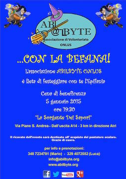 ATRI (TE) – Lunedì prossimo, 5 gennaio alle ore 19.30, presso il ristorante “La sorgente dei sapori”, in via Piane S. Andrea a 3 km in direzione Atri dall’uscita A14 di Pineto cena di beneficienza. L’iniziativa è promossa da Abilbyte onlus, che per il quarto anno consecutivo propone “Abilbyte con la Befana”. Durante la cena ci saranno animazione e giochi per grandi e piccoli.