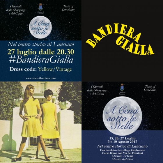 LANCIANO (CH) – Oggi, giovedì 27 luglio, a Lanciano – nell’ambito della rassegna promossa dal Comune di Lanciano dei “Giovedì dello Shopping e del Gusto” – Taste of Lanciano, il brand nato per riunire le tradizioni, la cultura, l’enogastronomia e l’atmosfera di un centro storico fra i più belli del Centro Italia, propone “A cena sotto le stelle – Dress code: Bandiera Gialla”; un’unica tavolata ideale per collegare Corso Roma a Via dei Frentani passando per Piazza Plebiscito.